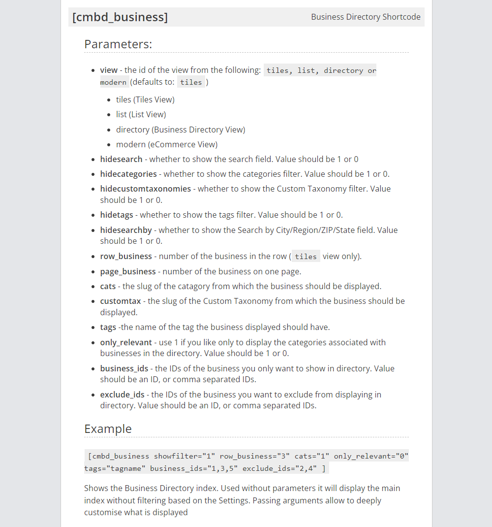 The business directory can be placed on any other post/page, and some global plugin parameters can be overridden with the help of the shortcode.