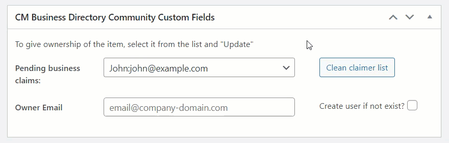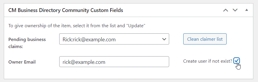 Another way, you can visit the business page on the back-end and check the box CM Business Directory Community Custom Fields. It will show a dropdown with all users who claim this page. You can choose the one that is suitable and update the business.