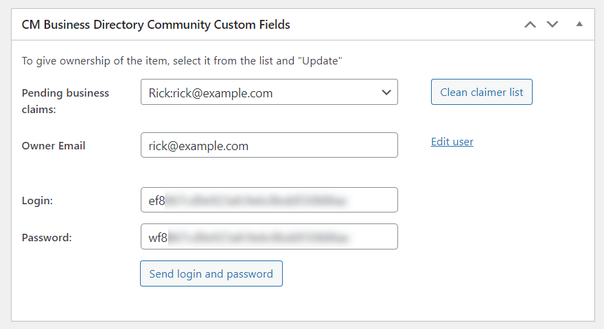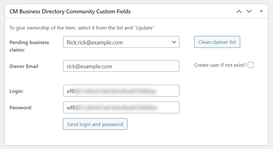 Get back to that box - there will appear two fields for a login and password, which you can send to the specified email. The user will be able to login using these credentials and edit his business page even not being registered user on your site.