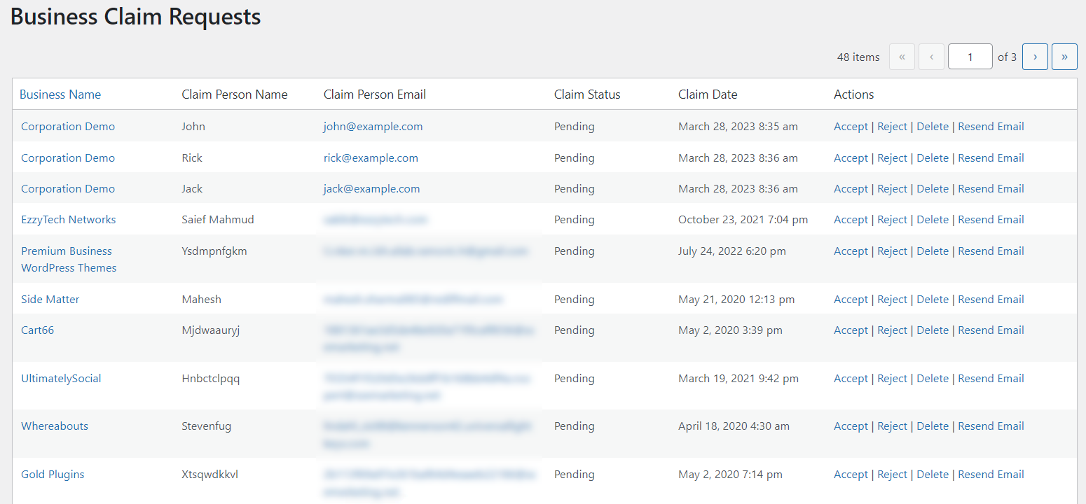 First - by clicking on the Claim Requests in the plugin menu. You will see there the list of all request: what business page is claimed, who claimed, status and data of the claim. There are also buttons for managing each request - you can accept, reject, delete the request, or resend email.