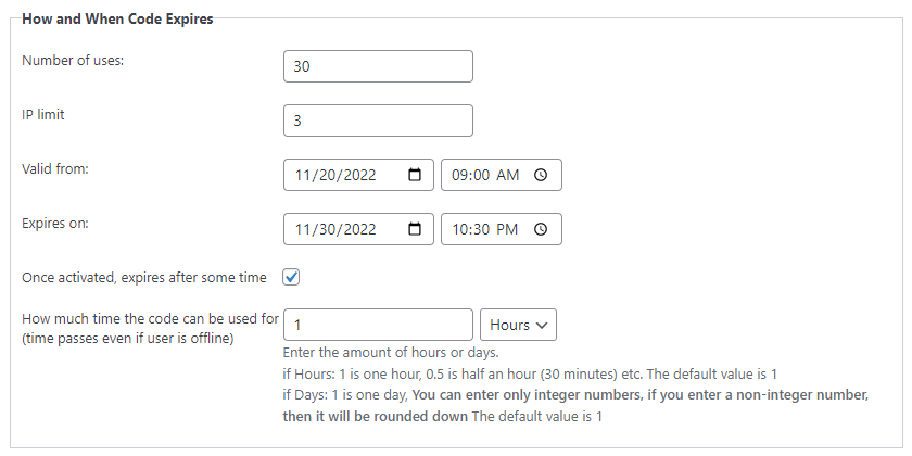 - Code Timelines: Set when codes can be used and for how long after activation.