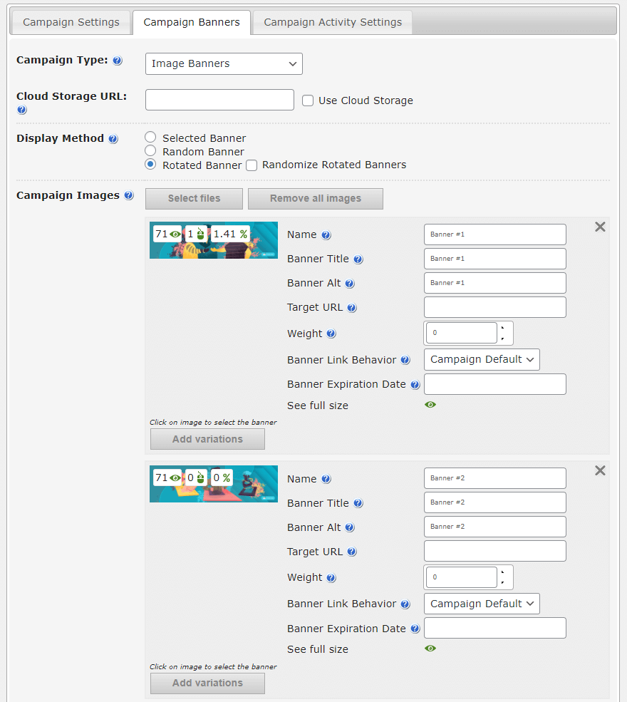 • Variable Image Banner Display: Show image banners that change randomly, by uploading multiple banners tied to a single campaign.