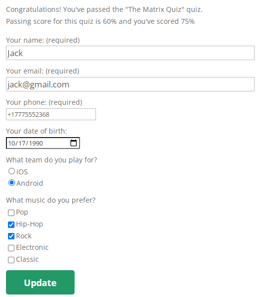 • Profile Enhancement: Collect additional user information post-quiz, requiring the After Registration Extended Profile Fields plugin.