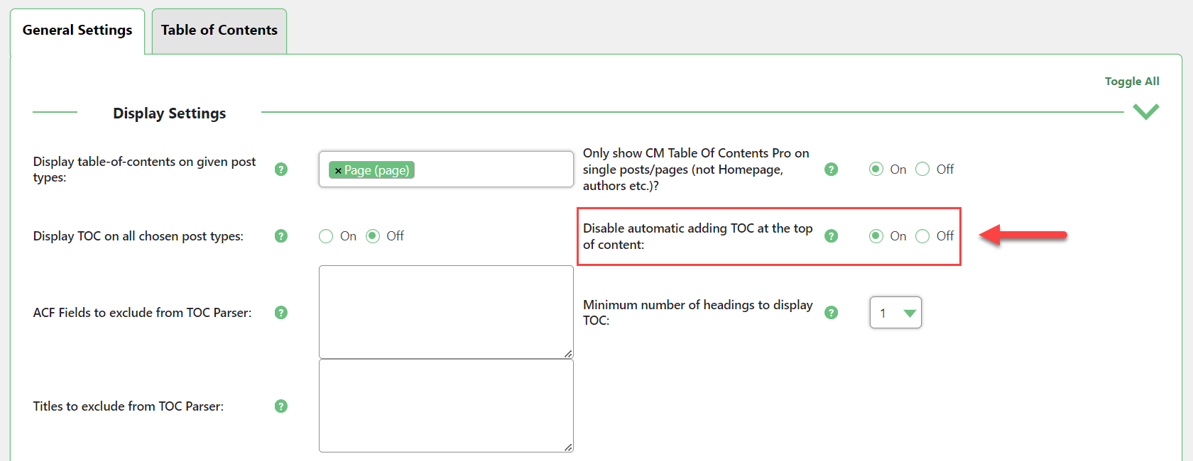By default, when you enable the TOC functionality, the TOC is displayed at the top of the page.