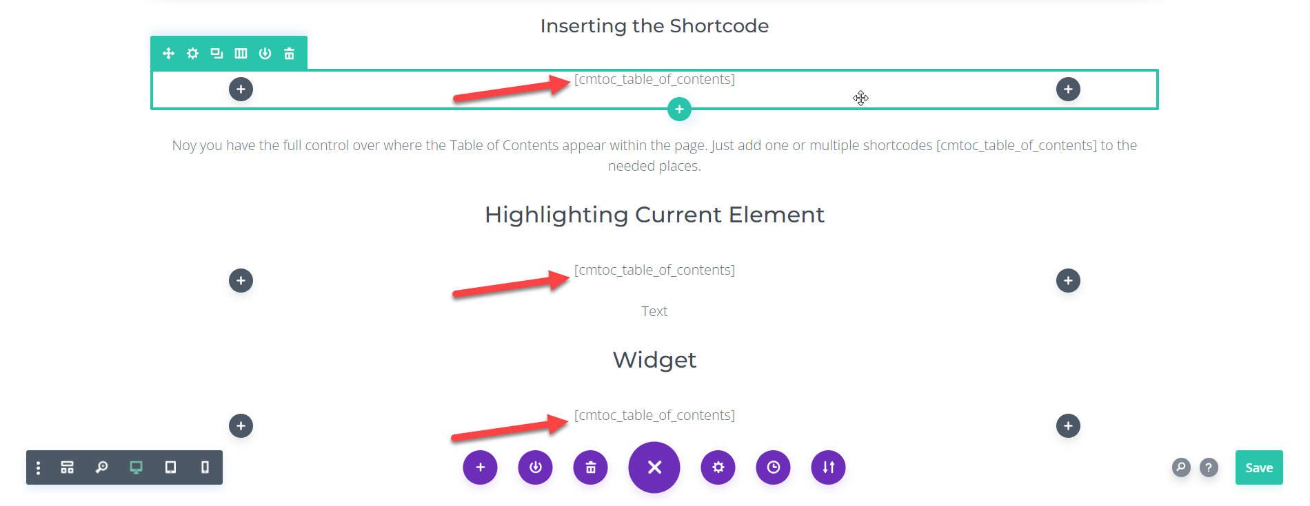Just add one or multiple shortcodes [сmtoc_table_of_contents] to the needed places.
