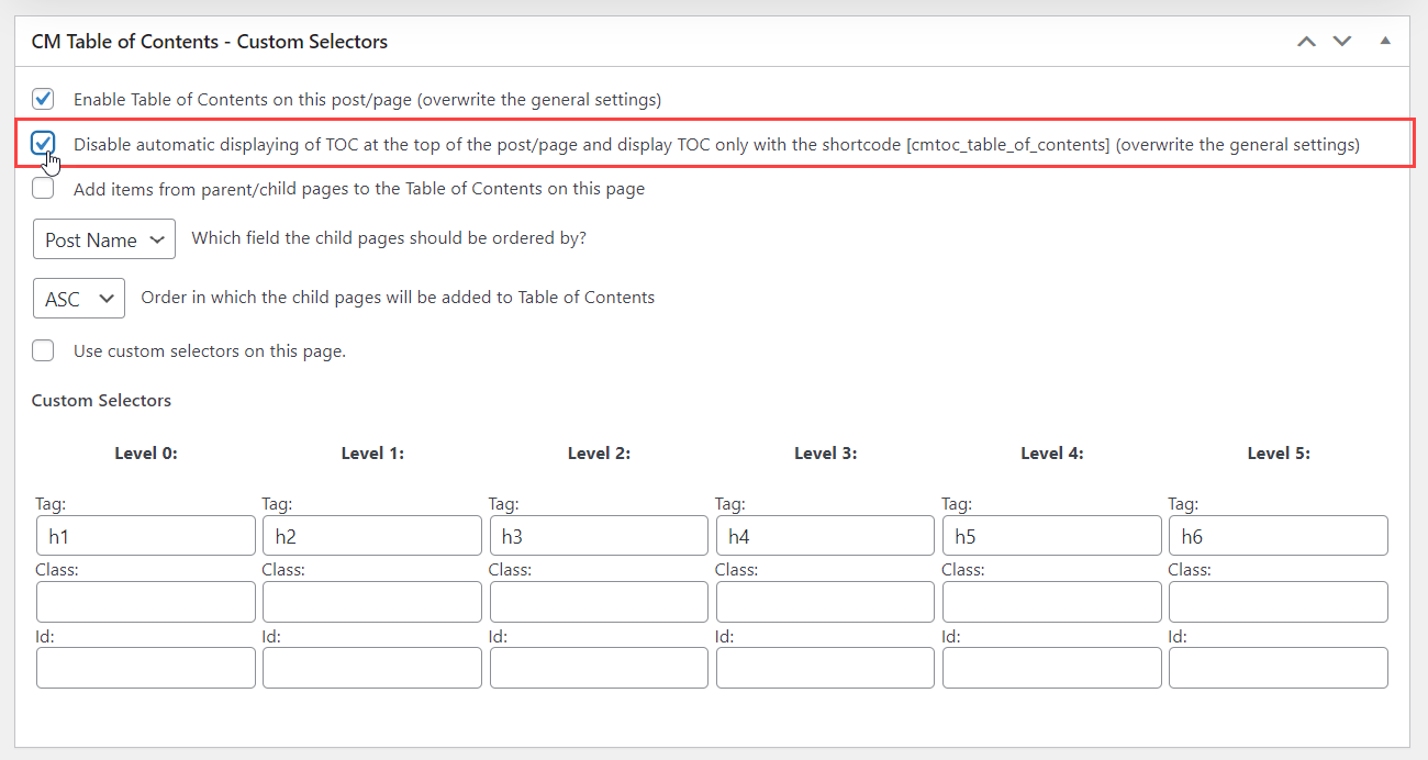 It can be done while editing the page in the metabox CM Table of Contents - Custom Selectors.